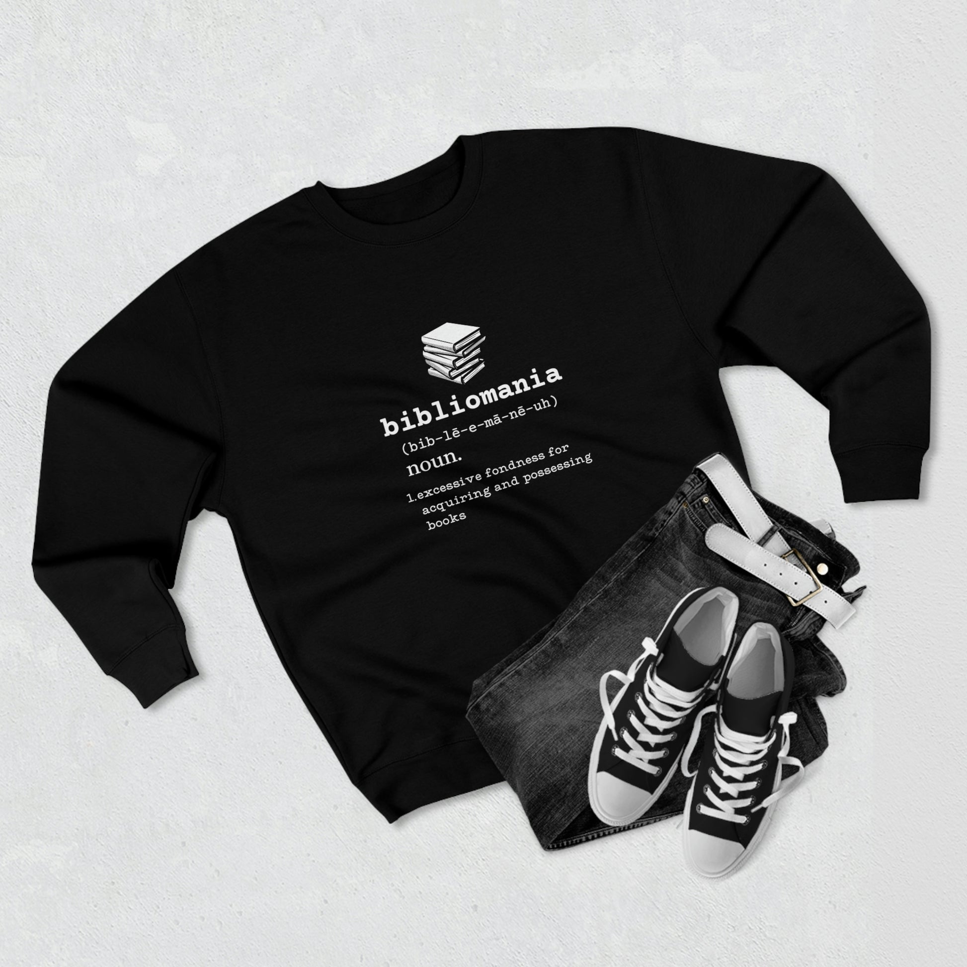 Bibliomania Excessive Fondness of Books - Premium Crewneck Sweatshirt - Black, Funny Book Lover Gift, Gag Gift Book Collector