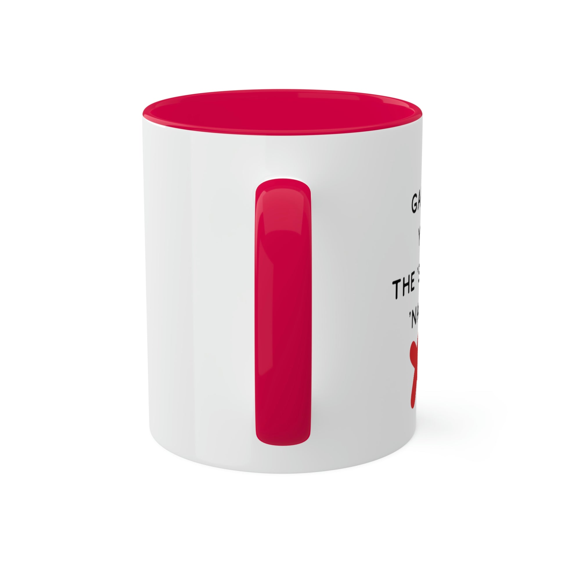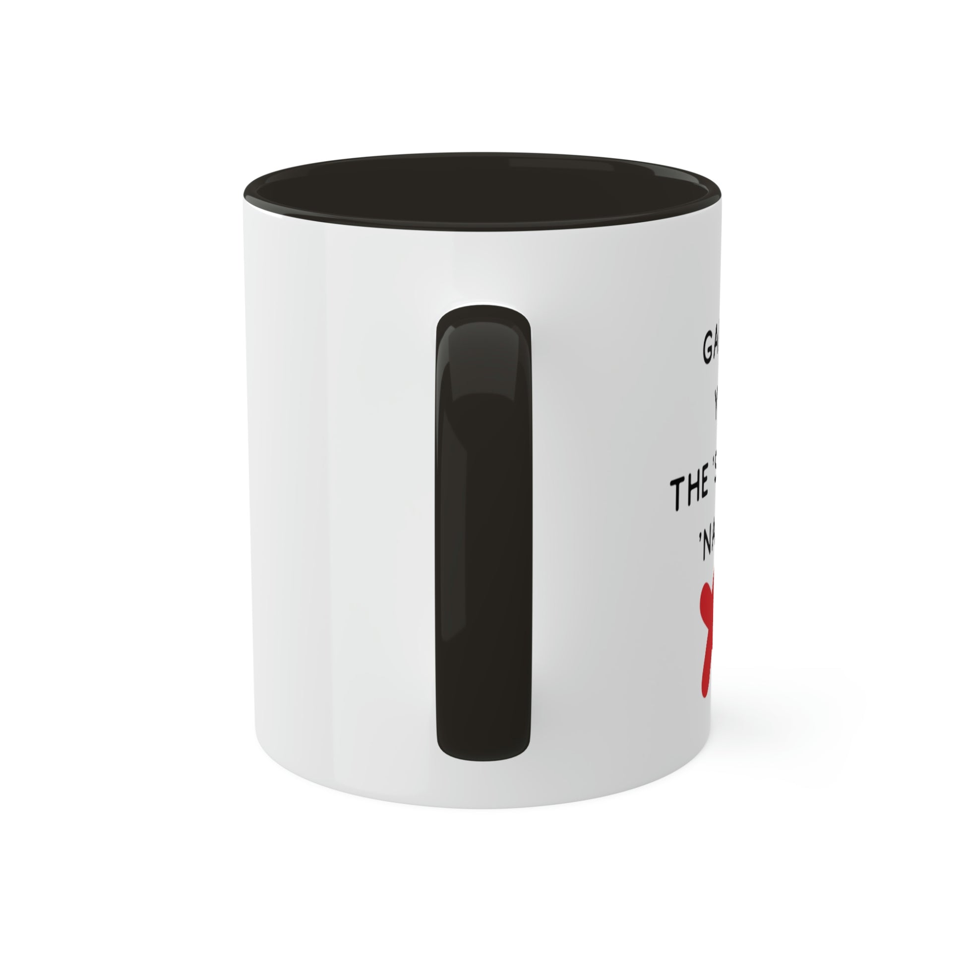 Mugs are a staple in every kitchen and when they're combined with a custom flair, they become instant favorites. Our "GALENTINES SHENANIGANS" coffee/tea mug is available in 2 cheerful color options, these mugs hold 11oz of your favorite beverage and come with a colored handle and interior. The glossy finish adds a classy touch that perfectly complements the high-fidelity artwork print. .: Material: 100% glossy ceramic .: One size: 11oz (0.33l) .: Easy-grip C-shaped handle
