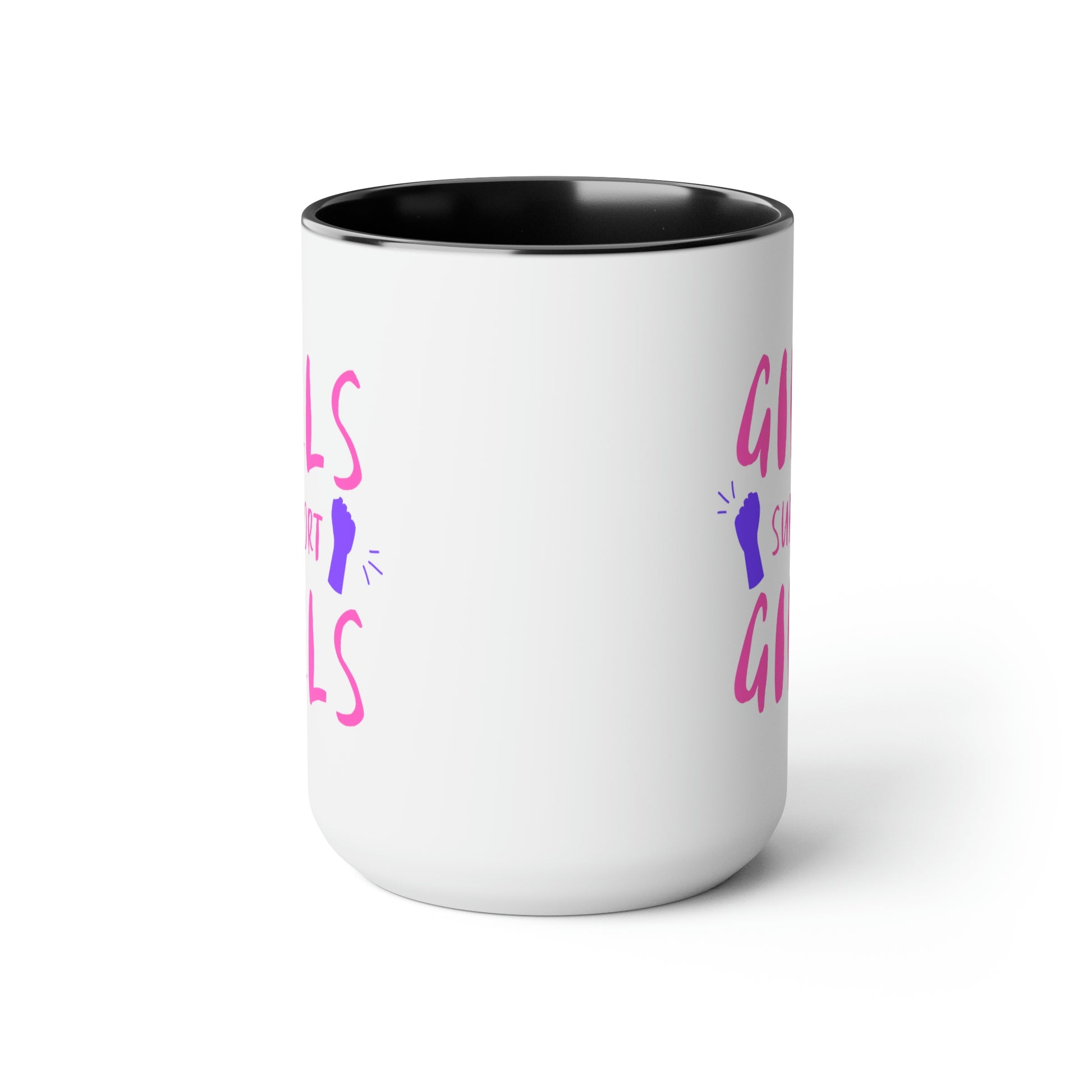 Here to bring big gulps of coffee and style, these "GIRLS SUPPORT GIRLS" two-tone coffee mugs help people around the world start the day just right. Choose between 2 different color options to best complement your designs. Each mug comes with a colored handle, a colored interior, and a classy, glossy finish so that your mugs become an instant favorite. .: Material: 100% ceramic .: One size: 15oz (0.44 l) .: Glossy finish