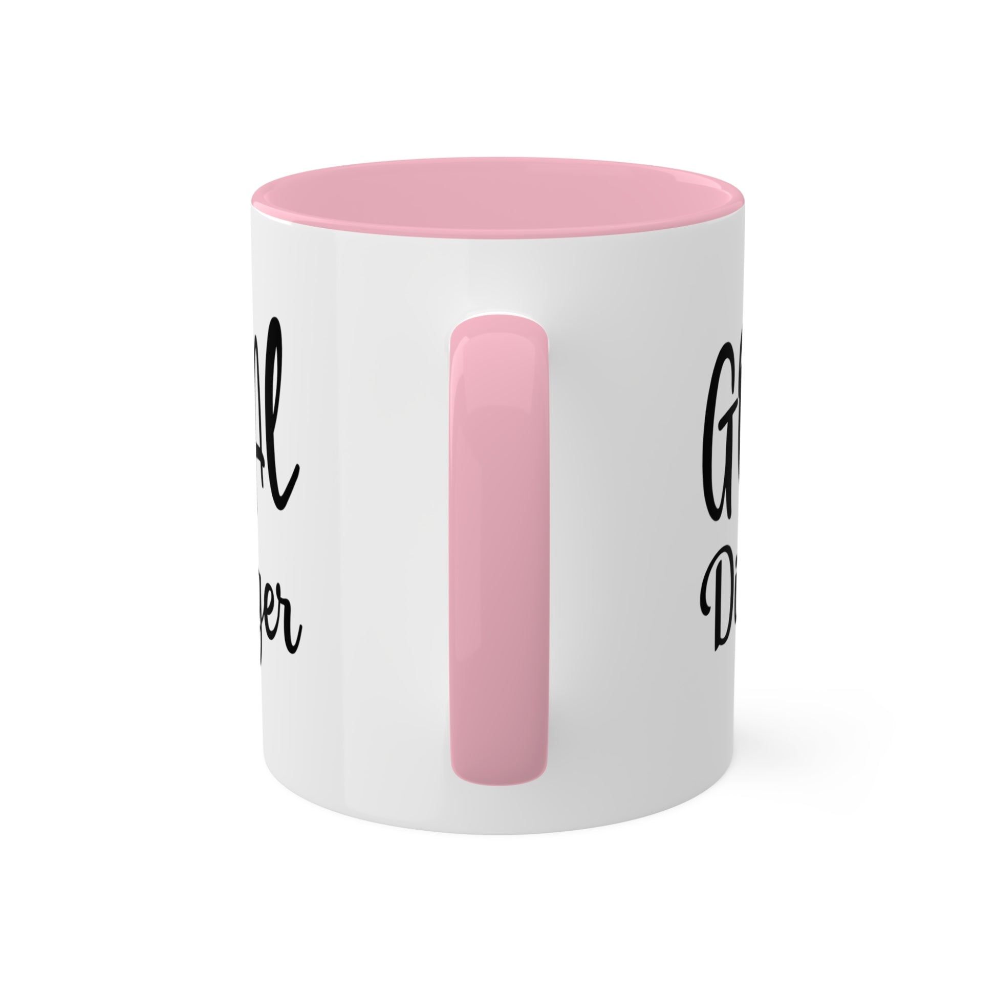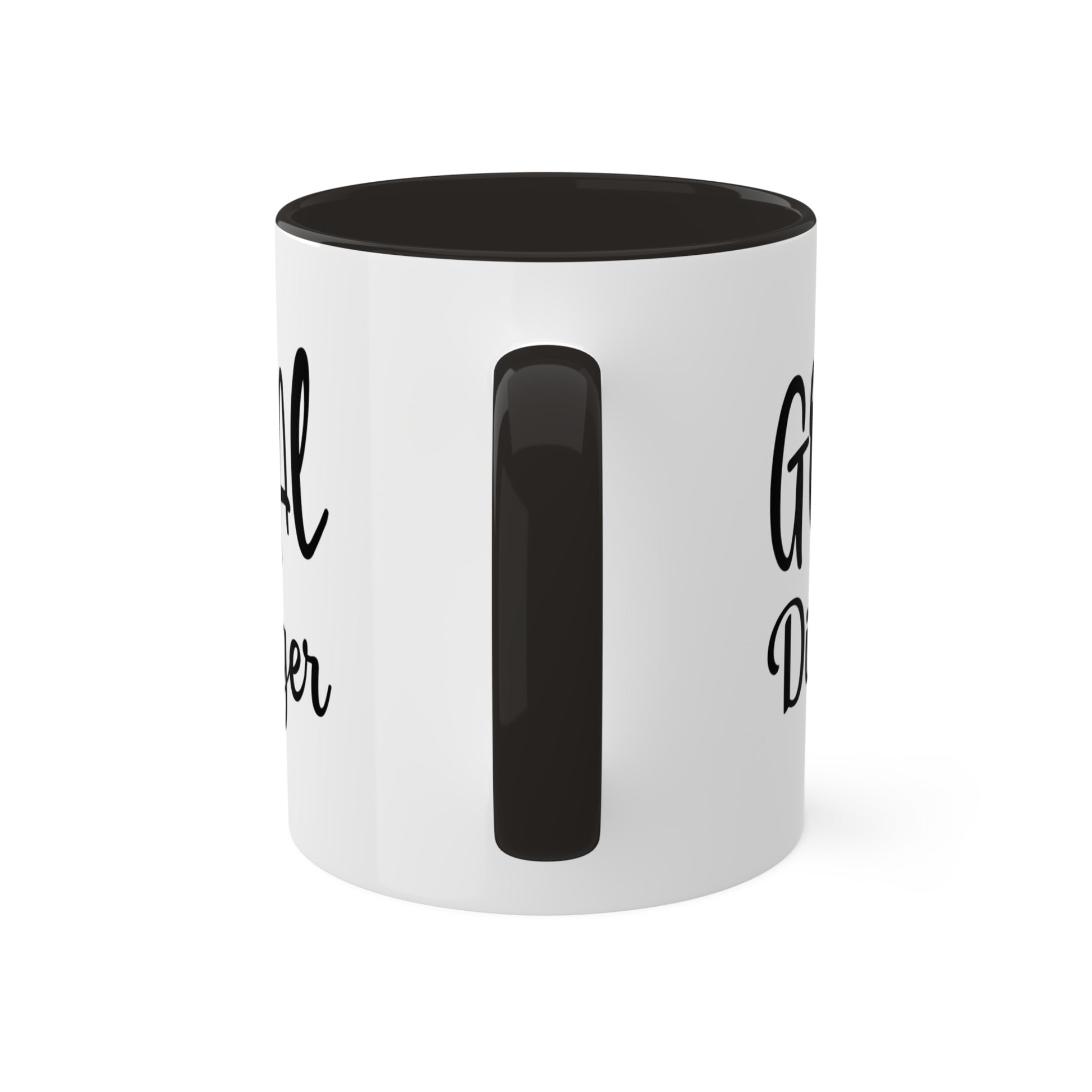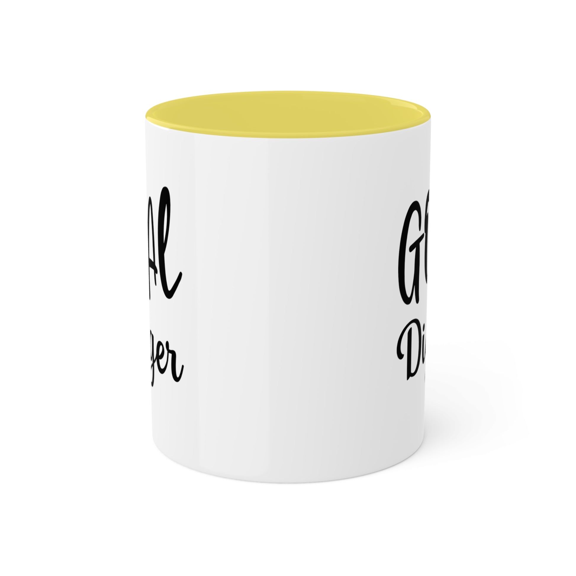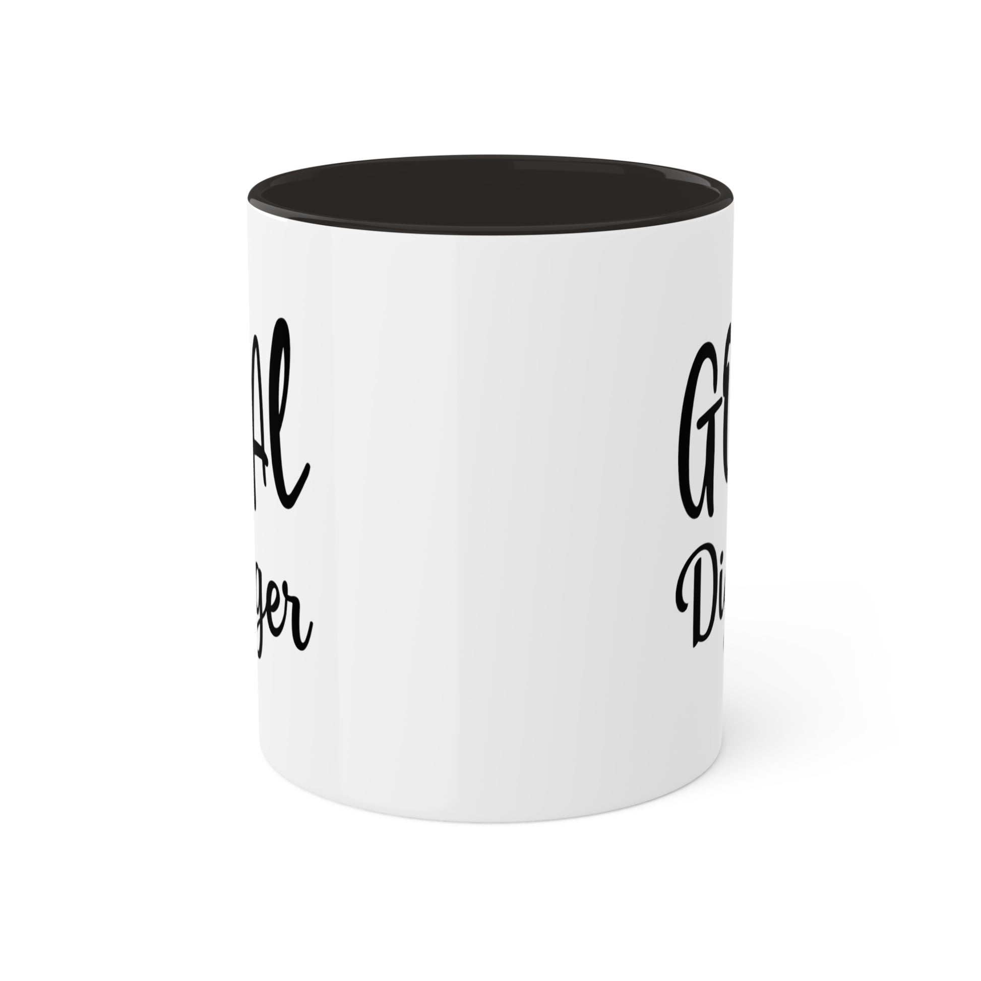 Mugs are a staple in every kitchen and when they're combined with a custom flair, they become instant favorites. Available in 7 color options, our "GOAL DIGGER" mugs hold 11oz of your favorite pick-me-up juice and come with a colored handle and interior. The glossy finish adds a classy touch that perfectly complements the high-fidelity artwork print. .: Material: 100% glossy ceramic .: Choose between 12 different accent colors .: One size: 11oz (0.33l) .: Easy-grip C-shaped handle