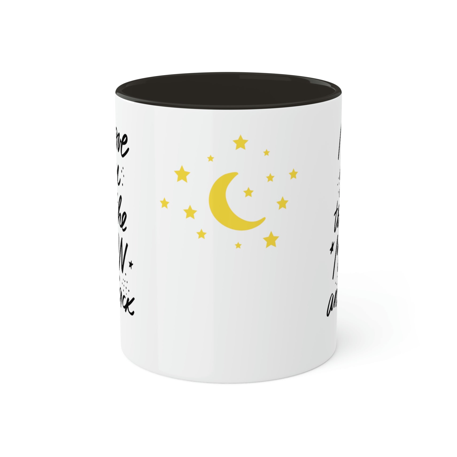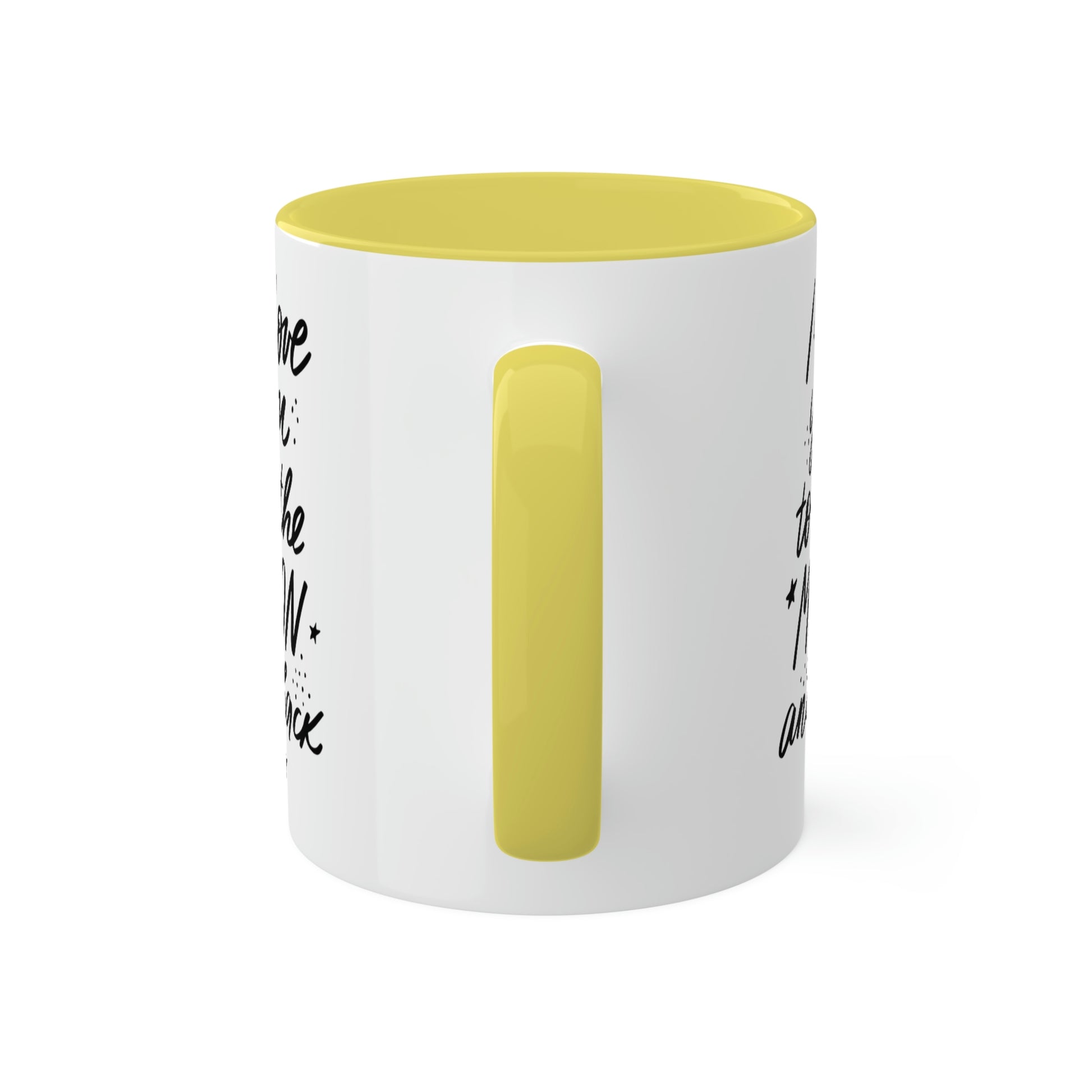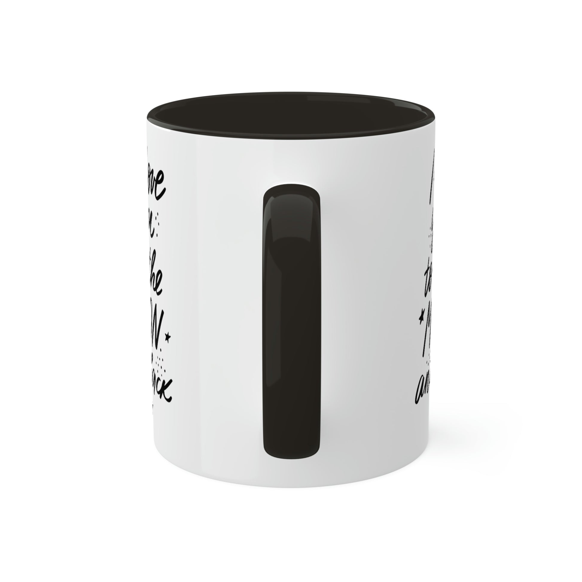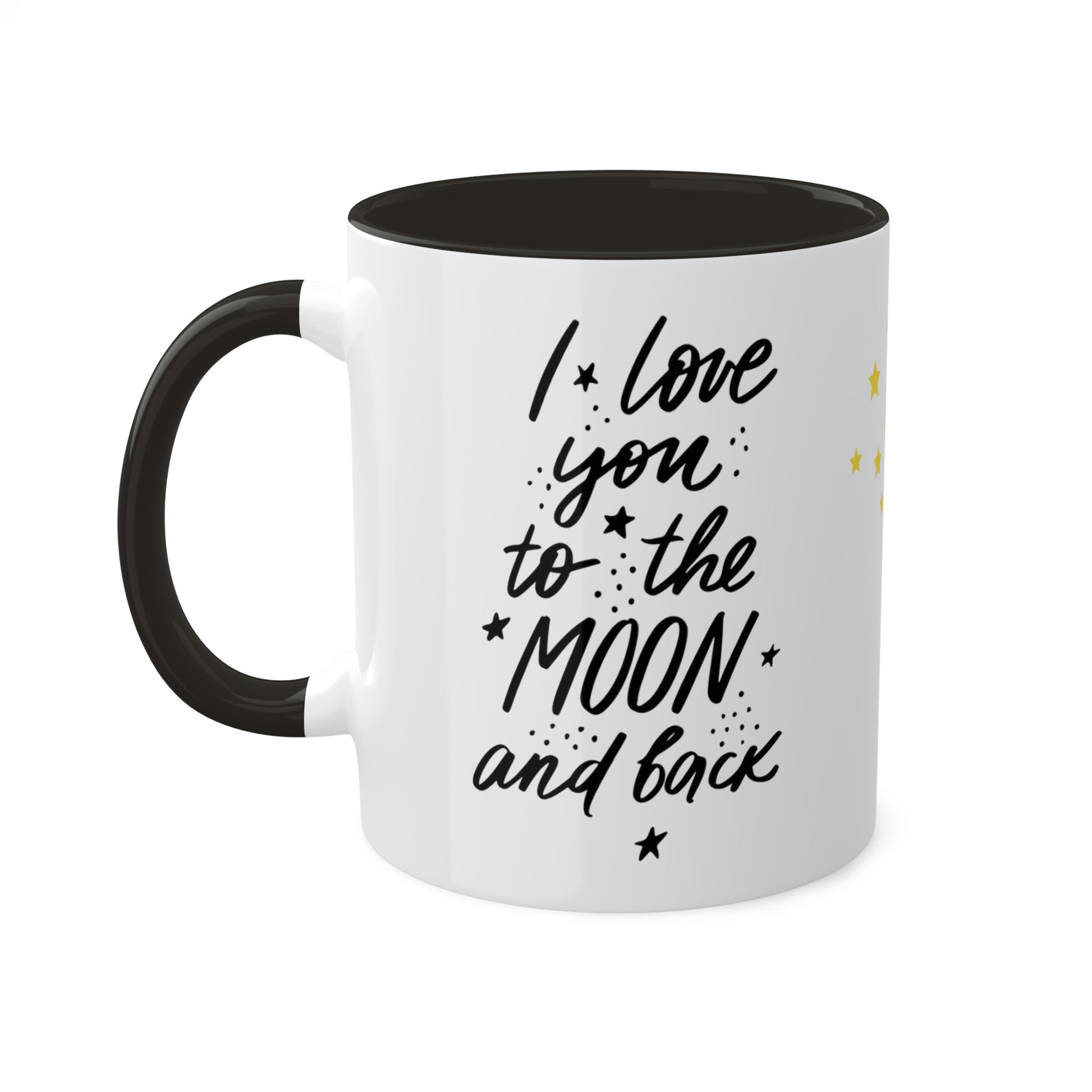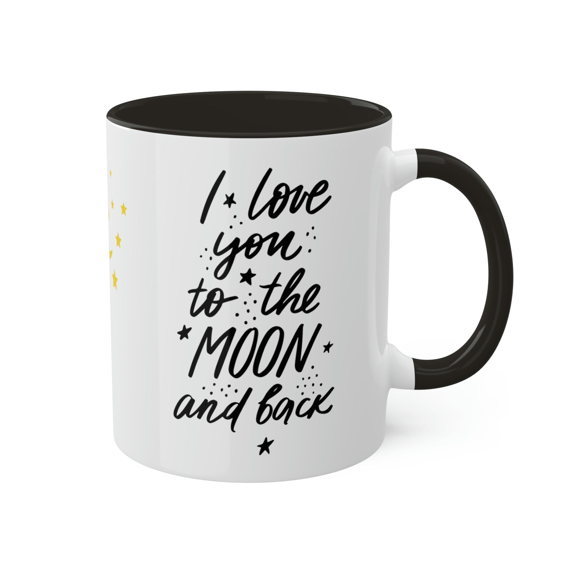 Mugs are a staple in every kitchen and when they're combined with a custom flair, they become instant favorites. Available in 2 color options, our "LOVE YOU TO THE MOON AND BACK" mugs hold 11oz of your favorite pick-me-up juice and come with a colored handle and interior. The glossy finish adds a classy touch that perfectly complements the high-fidelity artwork print. .: Material: 100% glossy ceramic .: Choose between 12 different accent colors .: One size: 11oz (0.33l) .: Easy-grip C-shaped handle