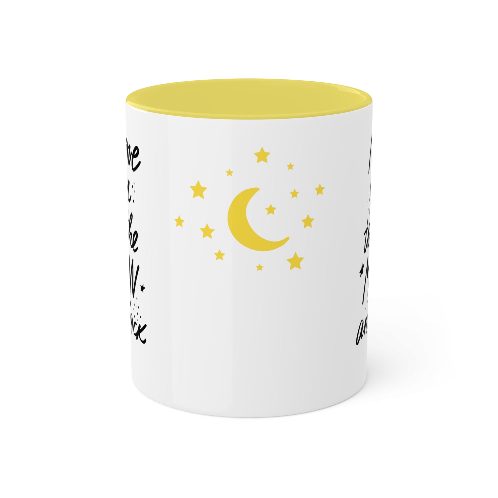 Mugs are a staple in every kitchen and when they're combined with a custom flair, they become instant favorites. Available in 2 color options, our "LOVE YOU TO THE MOON AND BACK" mugs hold 11oz of your favorite pick-me-up juice and come with a colored handle and interior. The glossy finish adds a classy touch that perfectly complements the high-fidelity artwork print. .: Material: 100% glossy ceramic .: Choose between 12 different accent colors .: One size: 11oz (0.33l) .: Easy-grip C-shaped handle