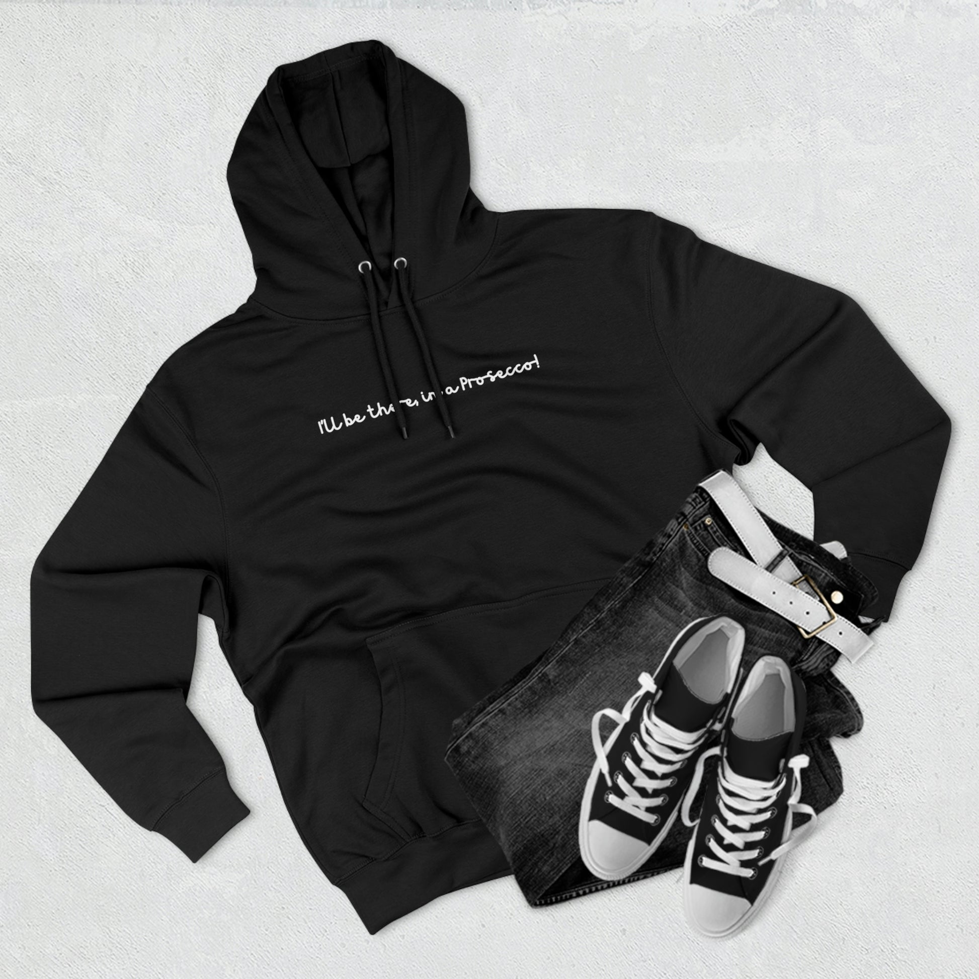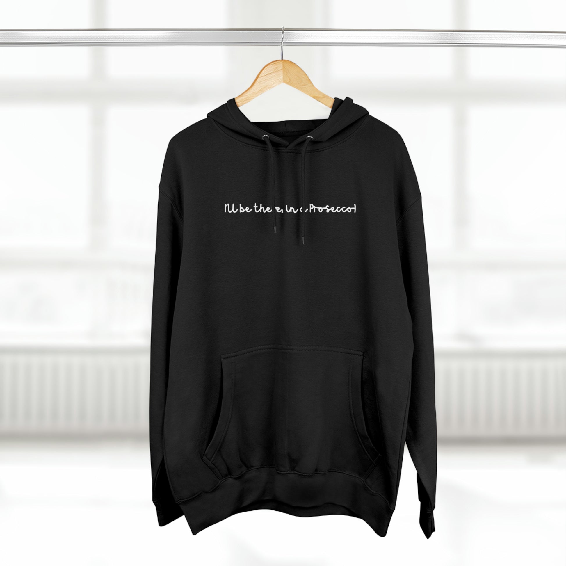 Beat the cold with our (wht) "I'LL BE THERE IN A PROSECCO!" premium pullover hoodie that’s just the right layer of warm and cozy. Made with three-panel fleece lining, this pullover is double stitched for durability and roomy. Pick from 2 colors to match your style.