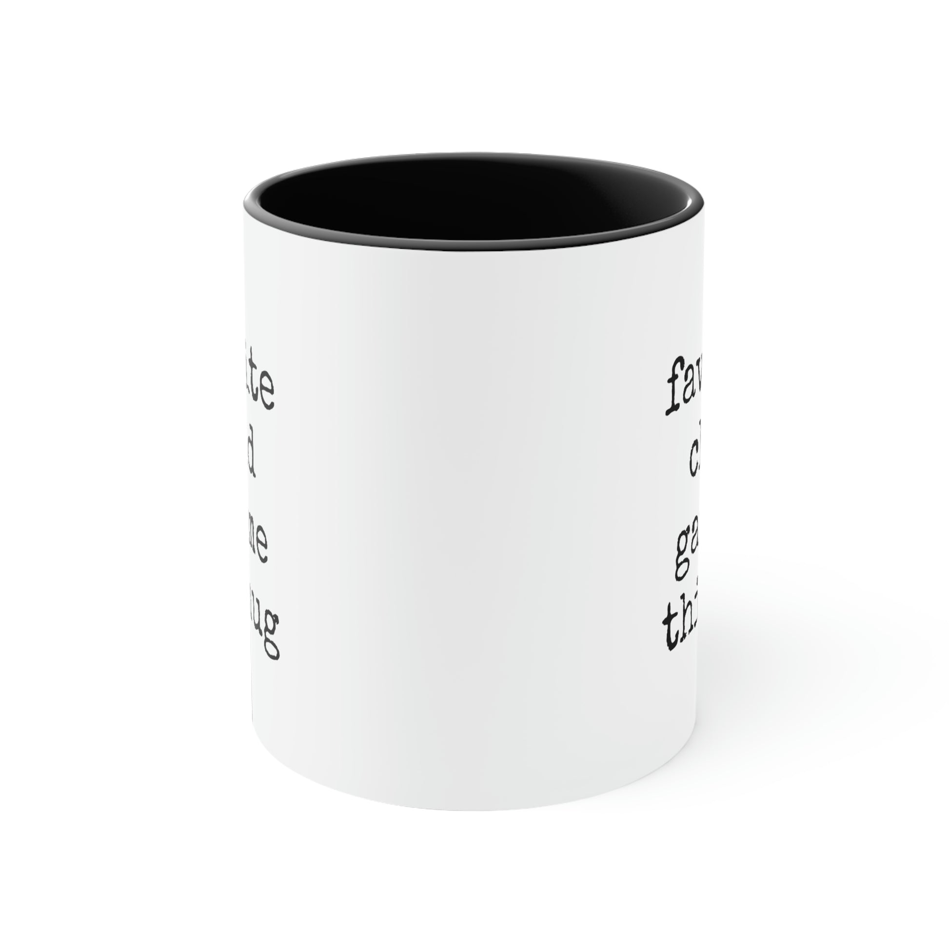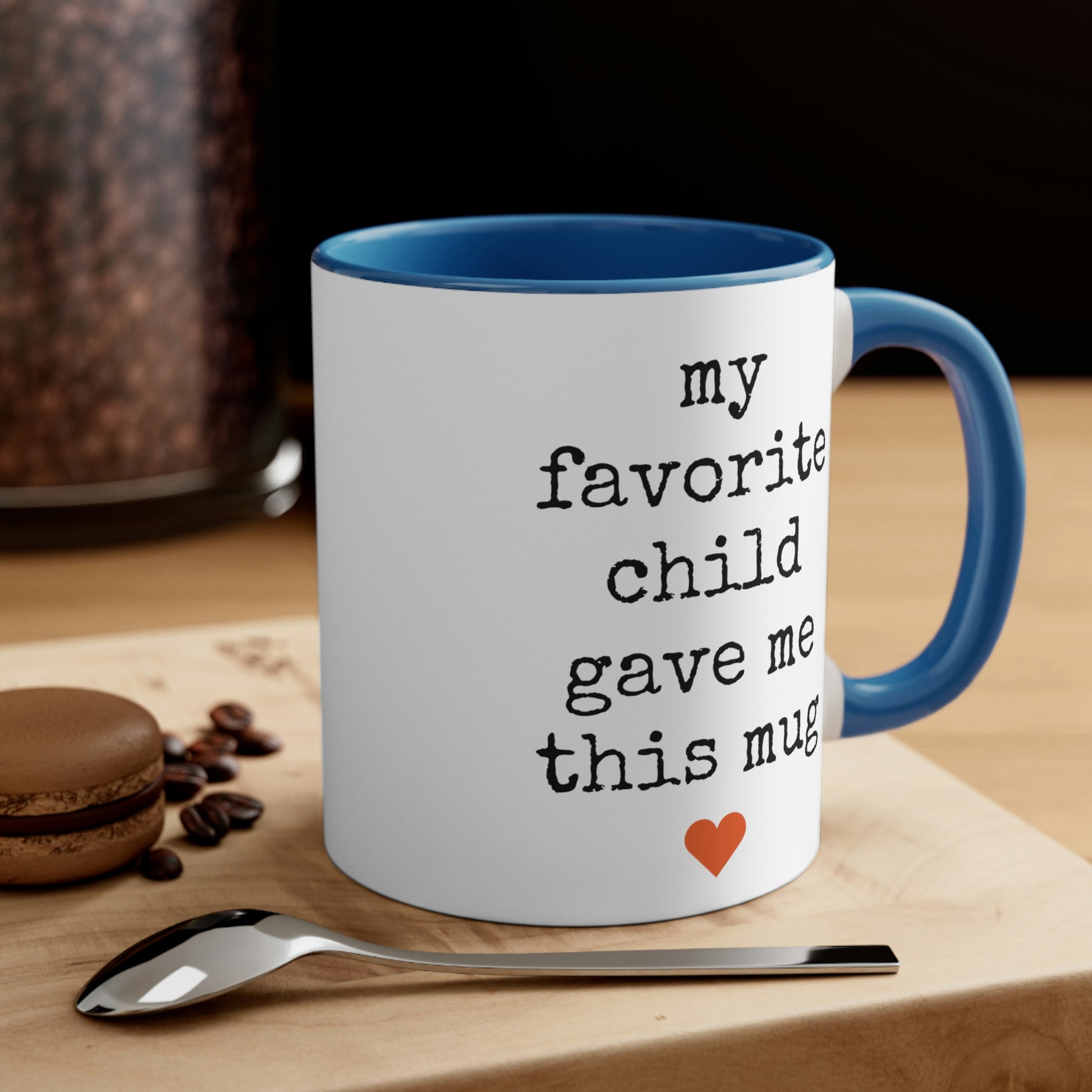 Add some color to your routine with our "MY FAVORITE CHILD GAVE ME THIS MUG" two-tone, custom accent coffee mug. This 11oz mug features an accented C-Handle that is comfortable to use, as well as an accented interior to add more contrast and character.