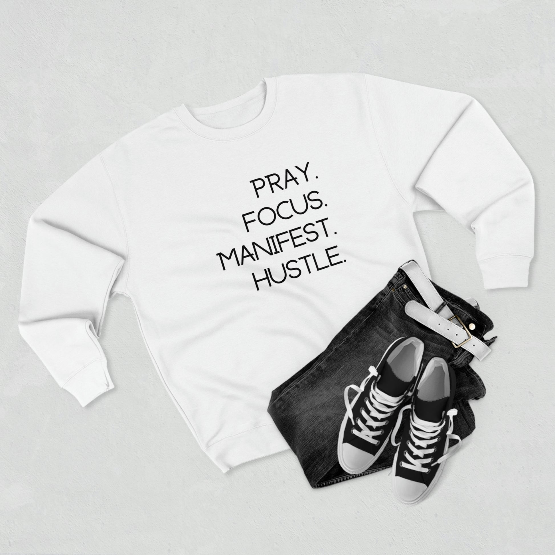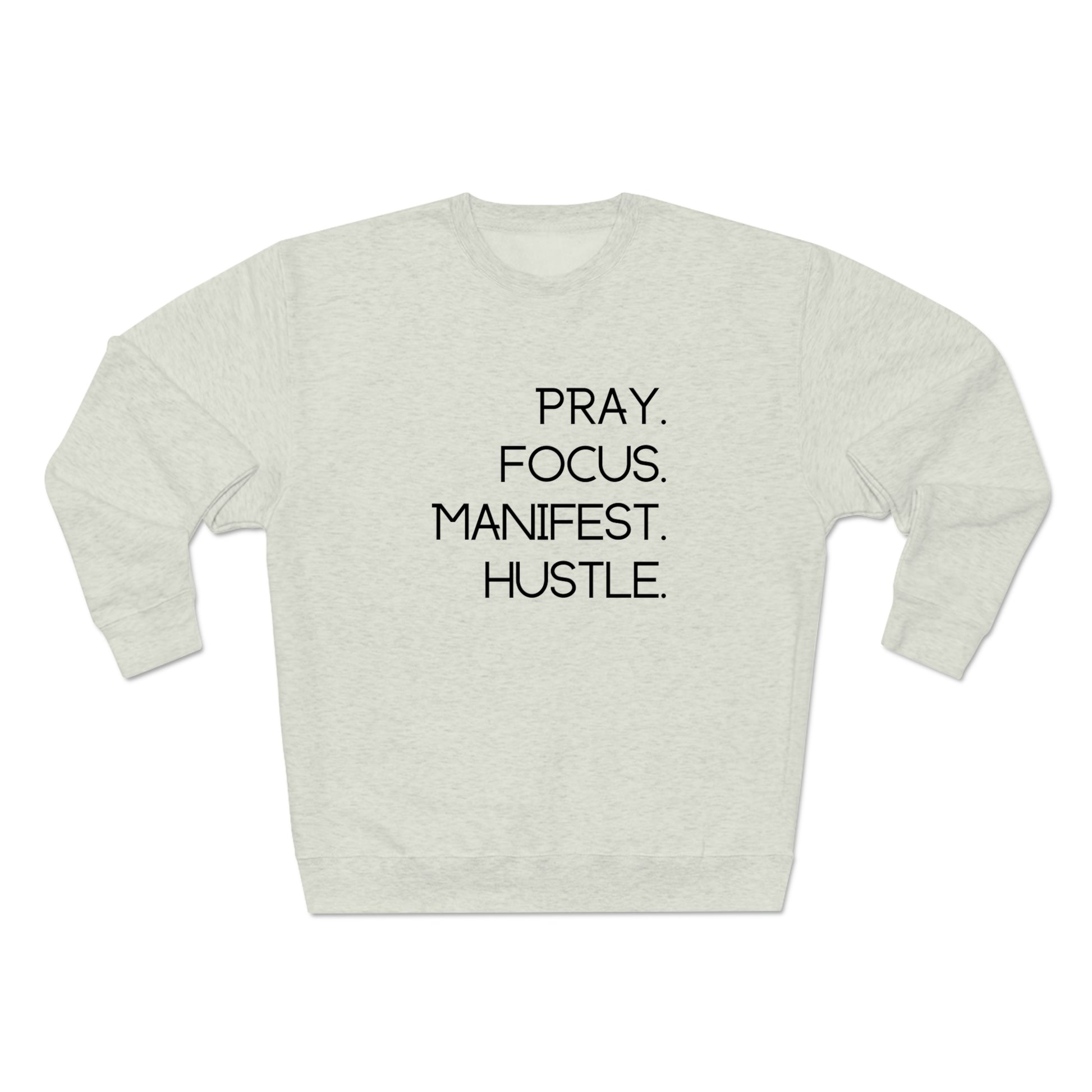 Pray. Focus. Manifest. Hustle. - Unisex Premium Crewneck Sweatshirt - Empowerment Message, Strong Driven Woman Gift, Gift Idea for Ambitious Women