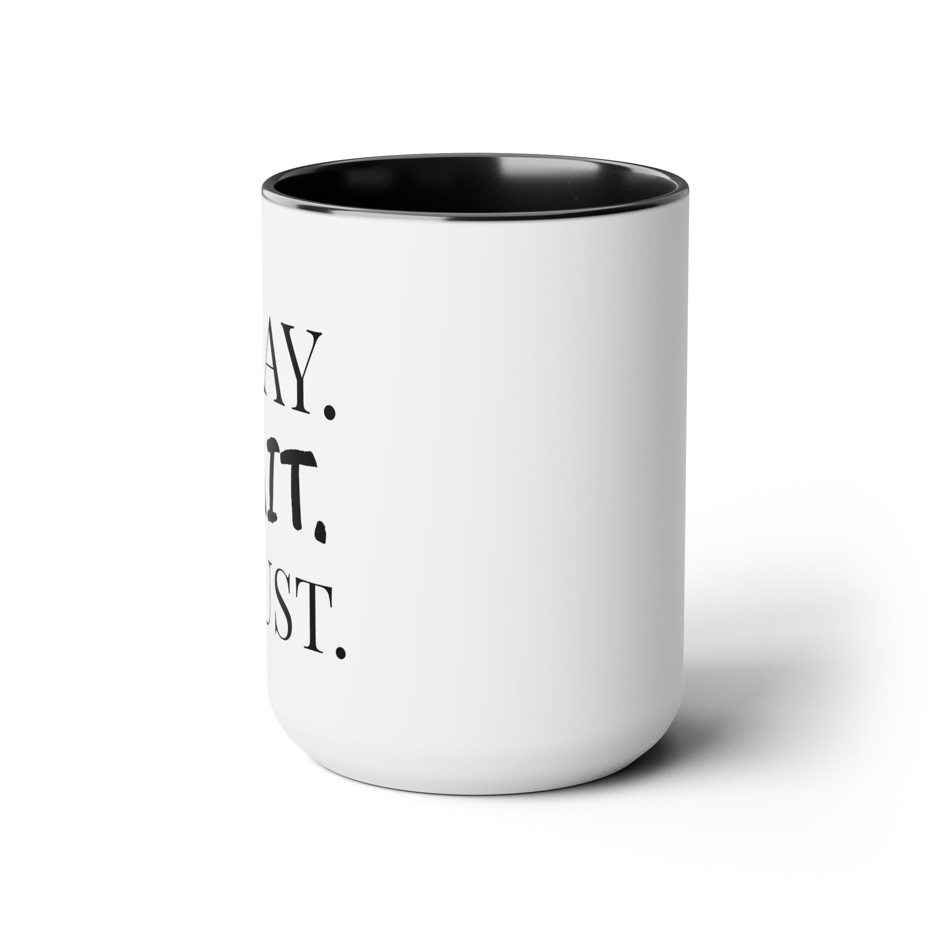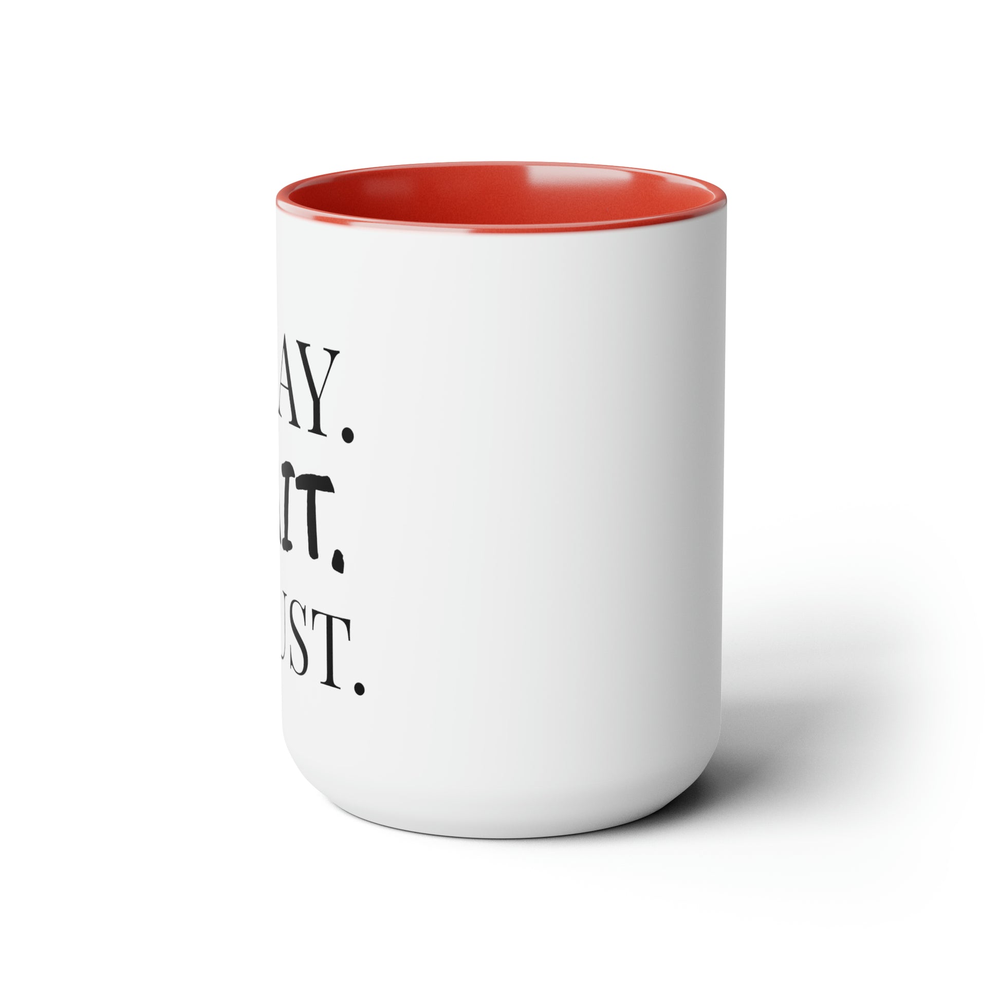 Here to bring big gulps of coffee and style, our "PRAY. WAIT. TRUST." two-tone coffee mugs help people around the world start the day just right. Choose between 5 different color options to best complement your designs. Each mug comes with a colored handle, a colored interior, and a classy, glossy finish so that your mugs become an instant favorite. .: Material: 100% ceramic .: One size: 15oz (0.44 l) .: Glossy finish .: Interior and handle available in 5 colors .: Easy-grip C-shaped handle